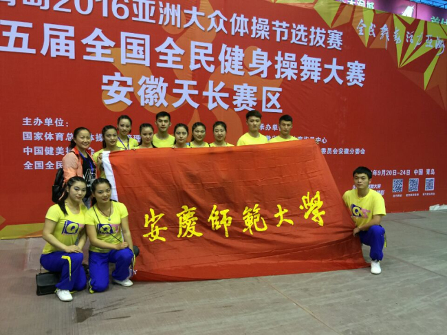 安徽省各地市代表队积极参与其中,实力旗鼓相当,竞争非常激烈。我校365英国上市网站官网2013级健美操专选班的同学在潮芳老师的带领下,代表安庆市参赛,发挥出卓越水平,一举夺得大学组广场舞规定套路第一名,荣获特等奖。